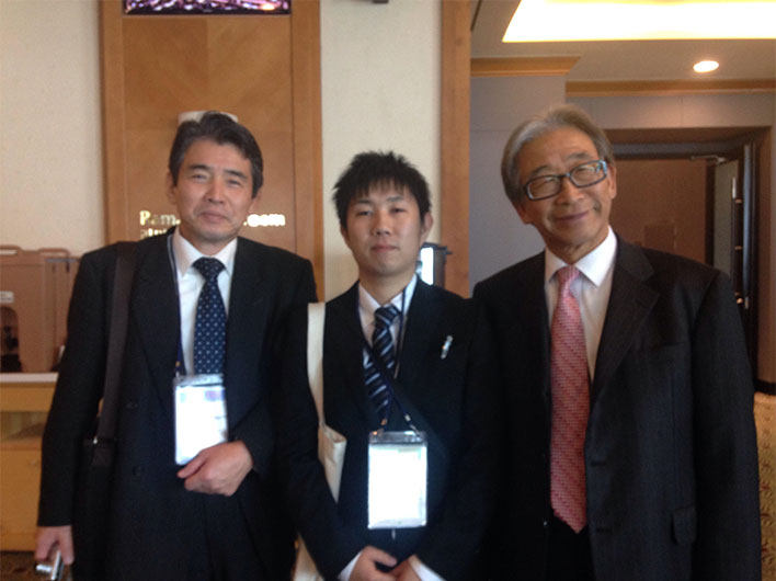 (向かって右端はHawong会長で、真中は高橋君、左端は筆者)とポスター発表用の展示物前で