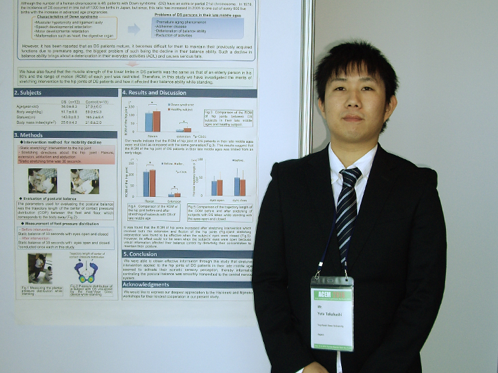 Asian Conference on Experimental Mechanics(ACEM) 2016が11月13日~16日にかけて韓国で開催され、本学大学院健康科学研究科2年在籍の高橋佑太君が「Influence of Stretching Intervention to Hip Joints in Postural Balance of Persons with Down Syndrome in Their Late Middle Age」と題して研究成果の発表を行いました。国際会議への参加や研究発表は高橋君にとって初めての経験であり、発表では参加者から英語による幾つかの質問がありました。国際会議という独特の雰囲気の中で緊張はピークに達しており、しかも慣れない英語での対応には苦戦を強いられましたが、何とか質問に応え相手にわかってもらうことができました。こうした貴重な経験が高橋君の今後に役立つことを希望します。