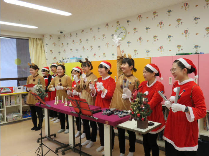 サンタクロースやトナカイに扮した学生たちによるSOZO音楽隊は、ハンドベルやトーンチャイムでクリスマスソングを演奏しました。また、体操を取り入れた「上を向いてあるこう」を合唱し、ゲストの方と一緒に体を動かしました。未来に向けた応援ソング「パプリカ」では、温かい手拍子の中、合唱とダンスを披露しました。最後に、一人ひとりにクリスマスカードをプレゼントし、クリスマス気分をお届けしました。