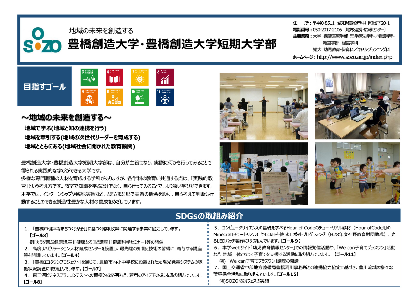 豊橋創造大学・豊橋創造大学短期大学部は、「持続可能な開発目標(SDGs)」の達成に向けて、本学が所在する豊橋市が取り組んでいる「豊橋市SDGs推進パートナー制度」へ登録をし、教育、研究、社会貢献活動等、様々な取り組みを展開しています。