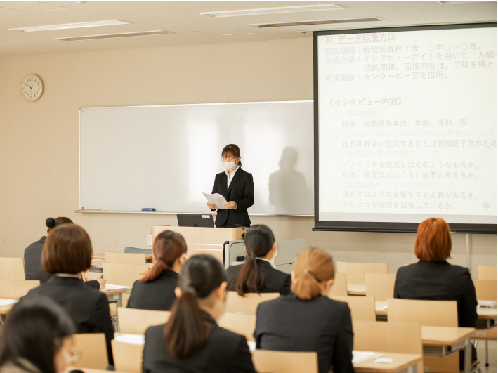 3年生の「看護学研究Ⅰ」では、看護研究の講義を受け、「研究」って何?から始まり、その後、担当教員のゼミに分かれて文献クリティークを重ね、文献検討をレポートにしました。それを基盤として、4年生では研究課題を明確にしていきました。研究課題が見えても、次にはどんな研究方法が適切か、研究の対象は、データ分析方法は等、一つ一つ壁を乗り越え、担当教員の助言のもと、ゼミ仲間と助け合って研究計画書を作り上げました。