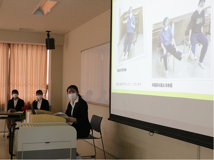 学生たちは10分の持ち時間のなかで、簡潔に発表し、改めて気づいたことなどを述べ、「今後に生かしていきたい」と介護への意欲を示しました。