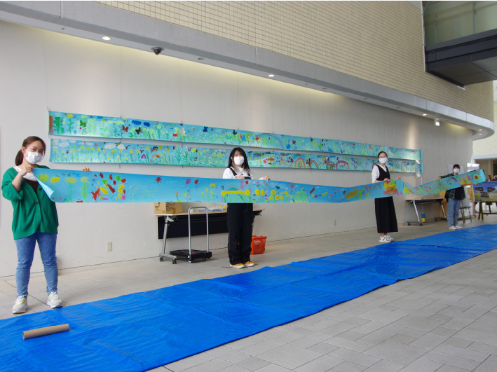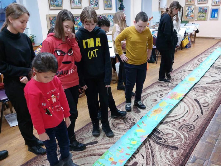 ウクライナの子どもたちへクリスマスカードとともに、昨年6月に子どもたちと制作した菜の花畑の絵巻物も同封し、その作品がジトーミル青少年芸術センターに届きました。10ⅿのロール紙に菜の花畑を描く活動は2017年より続いており、ウクライナの小学校でも制作しました。子どもたちによるアートの交流は、争いによって汚されるべきものではありません。