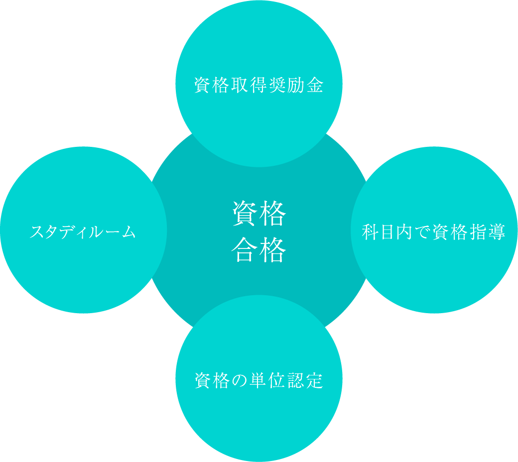 資格の単位認定、資格の奨励金、資格対応講座、スタディールームの完備など、