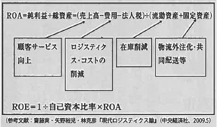 ロジスティクスの目標は、①在庫統制と②競争力の向上であり、結果としてROAの向上に貢献することにある。ROA(総資産利益率)を大きくするためには、業務費用を大きくするか、在庫を削減する必要があり、ROAとは、「スループットから業務費用を引いたもの」を「投入される経営資源を代表する在庫等」で割ったものである。