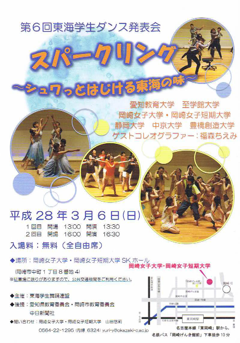 来月3月6日(日)、岡崎女子大学・岡崎女子短期大学にて、第6回東海学生ダンス発表会が行われます。この発表会は、東海学生舞踊連盟(東海地区の6大学)が企画・運営をしている発表会で、今年で6回目を迎えます。
