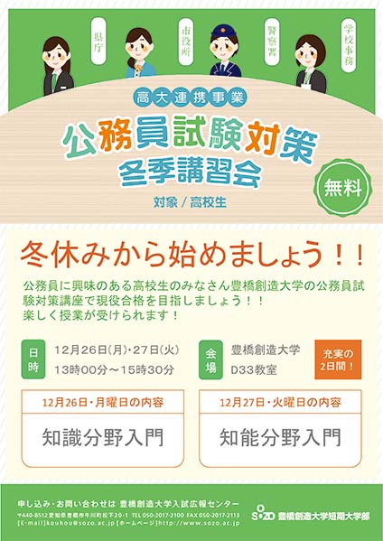 冬休みは公務員試験合格のために勉強を始めるのにピッタリの時期です。 この時期から目標を目指して頑張りましょう! 日程 12月26日(月) 27日(火) 時間 13時から15時30分 場所 豊橋創造大学短期大学部 公務員スタディールーム D棟3階 D33教室 詳しくはチラシをご覧ください。 ダウンロード [237KB]